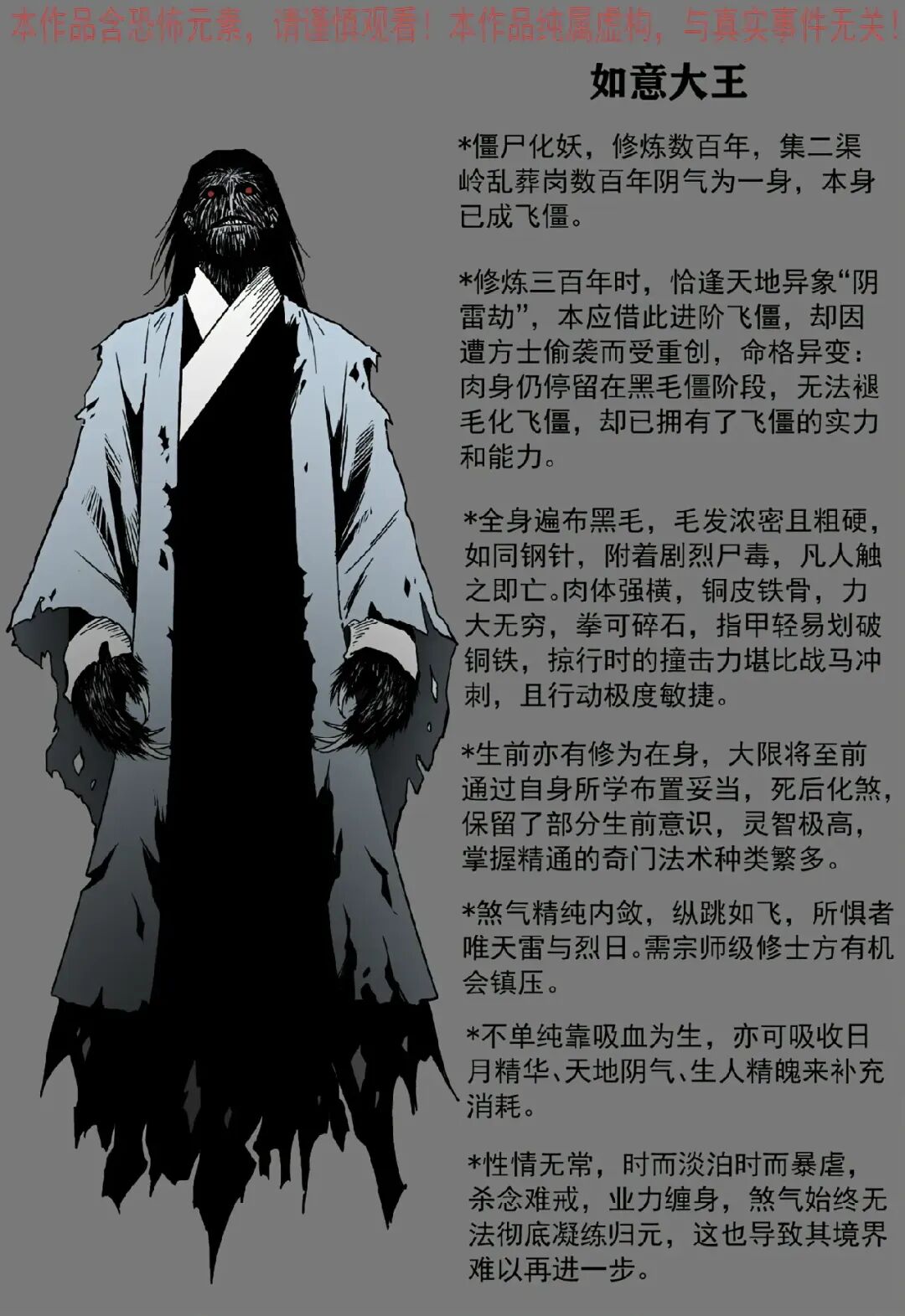 如意大王*僵尸化妖,修炼数百年,集二渠岭乱葬岗数百年阴气为一身,本身已成飞僵。*修炼三百年时,恰逢天地异象“阴雷劫”,本应借此进阶飞僵,却因遭方士偷袭而受重创,命格异变:肉身仍停留在黑毛僵阶段,无法褪毛化飞僵,却已拥有了飞僵的实力和能力。【如意大王】