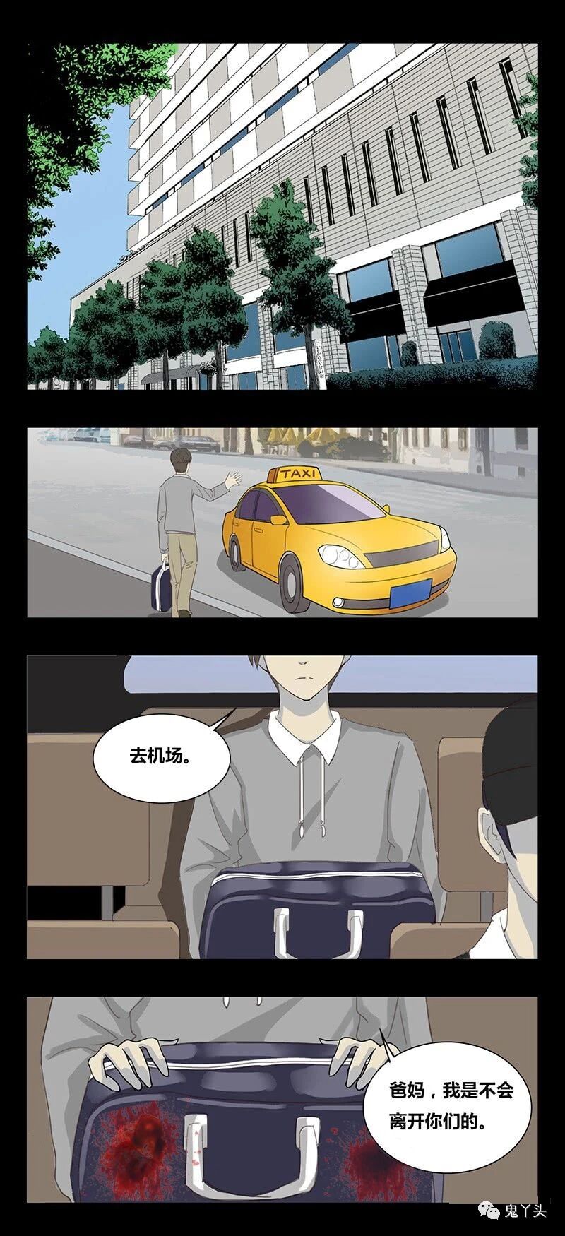 最后丧失主观意识的男主独自打车去机场,父母没有来送他;同时男主对着手里的包说“爸妈,我是不会离开你们的”。而包的另一面印出两片鲜红的血迹……