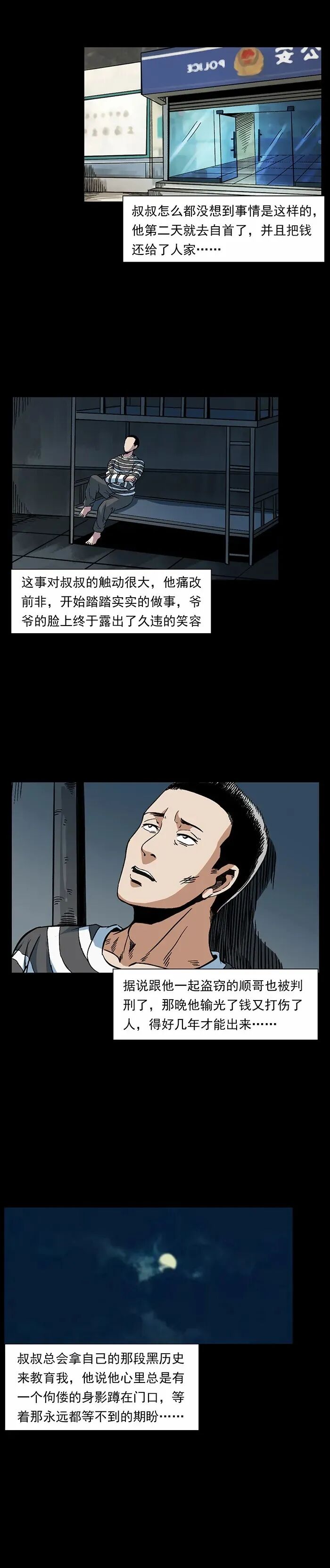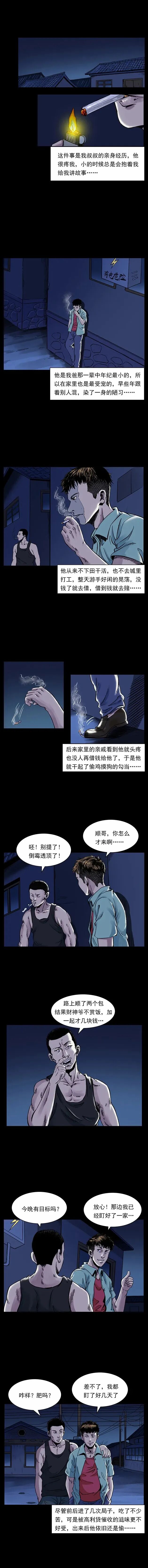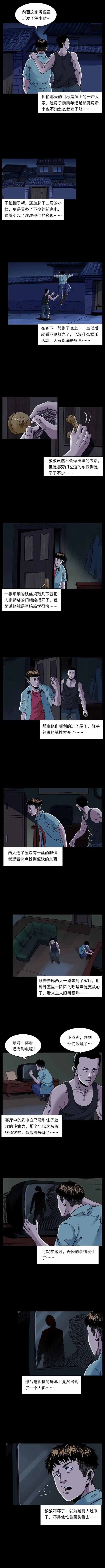 了叔叔游手好闲、偷盗成性,和同伙顺哥偷一户翻新盖楼的人家时,遭遇电视屏幕现黑影、关着的窗户窗帘无风飘动等诡异怪事,叔叔吓得想还钱,顺哥却执意带走赃款。叔叔回家后病倒,偷来的钱被爷爷发现,才得知这户人家的钱是老人儿子的工地意外赔偿款,老人因丧子精神失常。叔叔深受触动自首还钱,从此痛改前非踏实生活,而顺哥因赌钱输光还打人被判入狱,叔叔也常拿这段经历教育晚辈。【叔叔的黑历史】