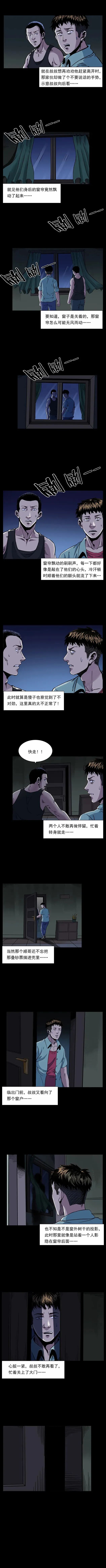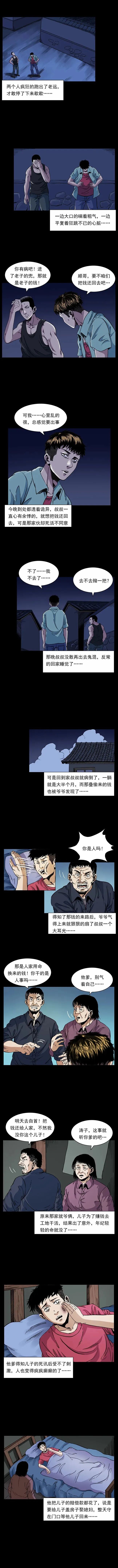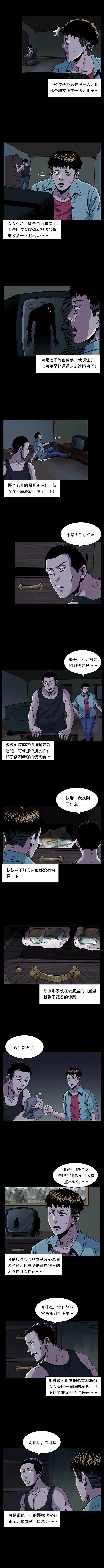 了叔叔游手好闲、偷盗成性,和同伙顺哥偷一户翻新盖楼的人家时,遭遇电视屏幕现黑影、关着的窗户窗帘无风飘动等诡异怪事,叔叔吓得想还钱,顺哥却执意带走赃款。叔叔回家后病倒,偷来的钱被爷爷发现,才得知这户人家的钱是老人儿子的工地意外赔偿款,老人因丧子精神失常。叔叔深受触动自首还钱,从此痛改前非踏实生活,而顺哥因赌钱输光还打人被判入狱,叔叔也常拿这段经历教育晚辈。【叔叔的黑历史】
