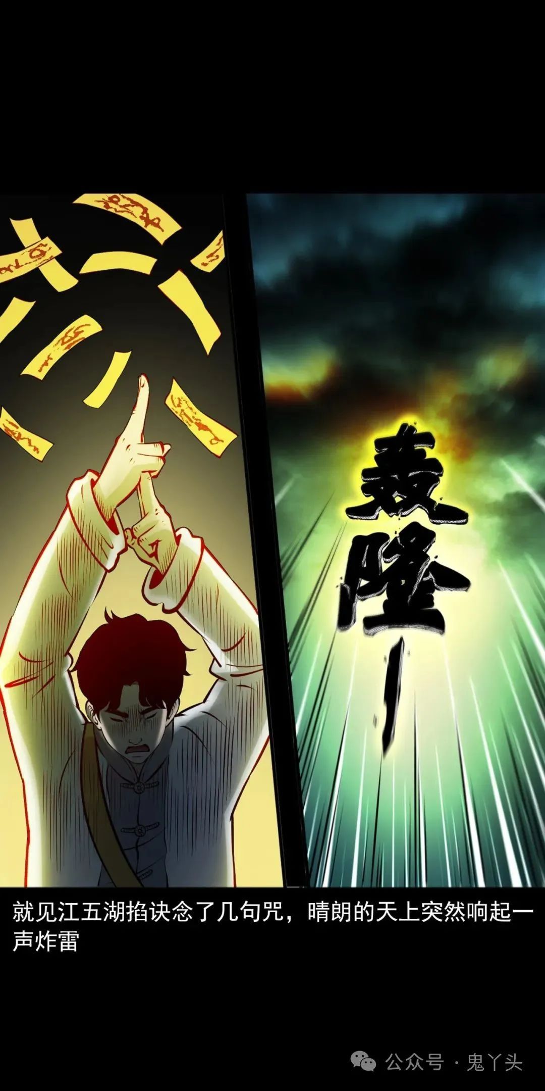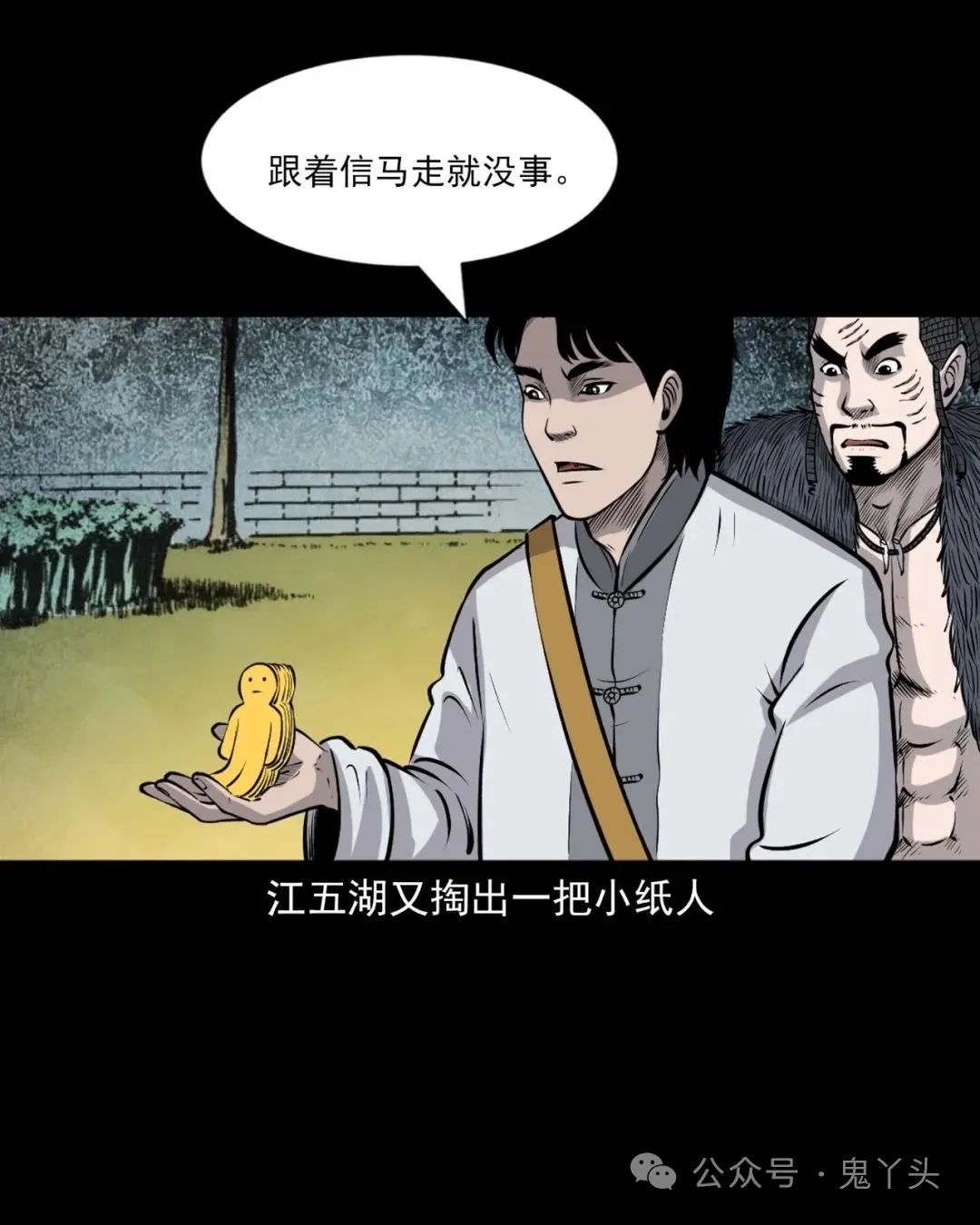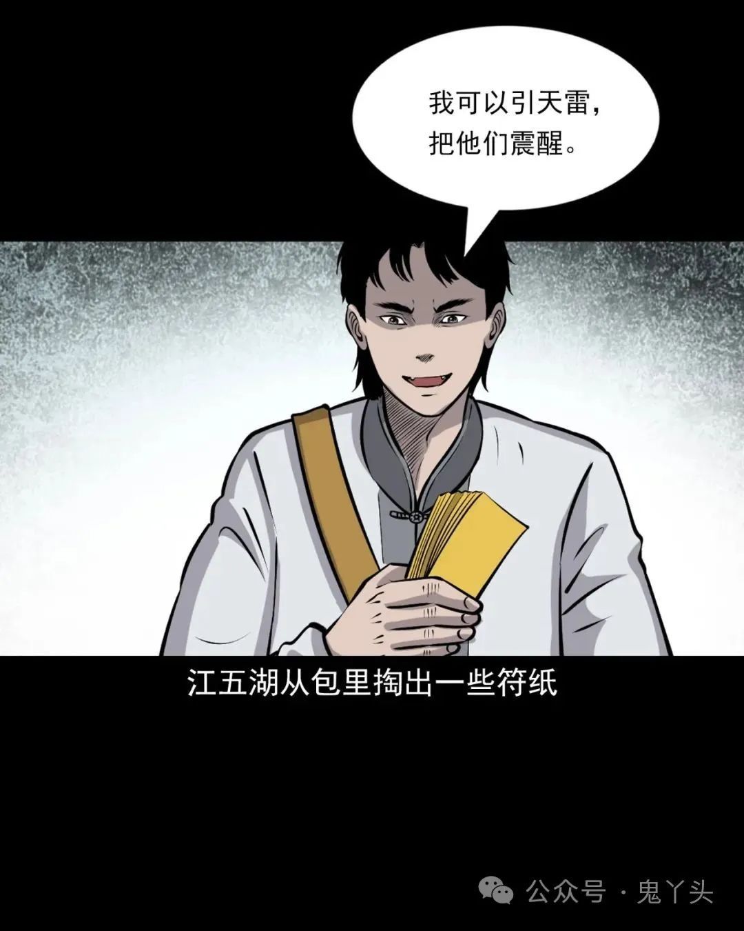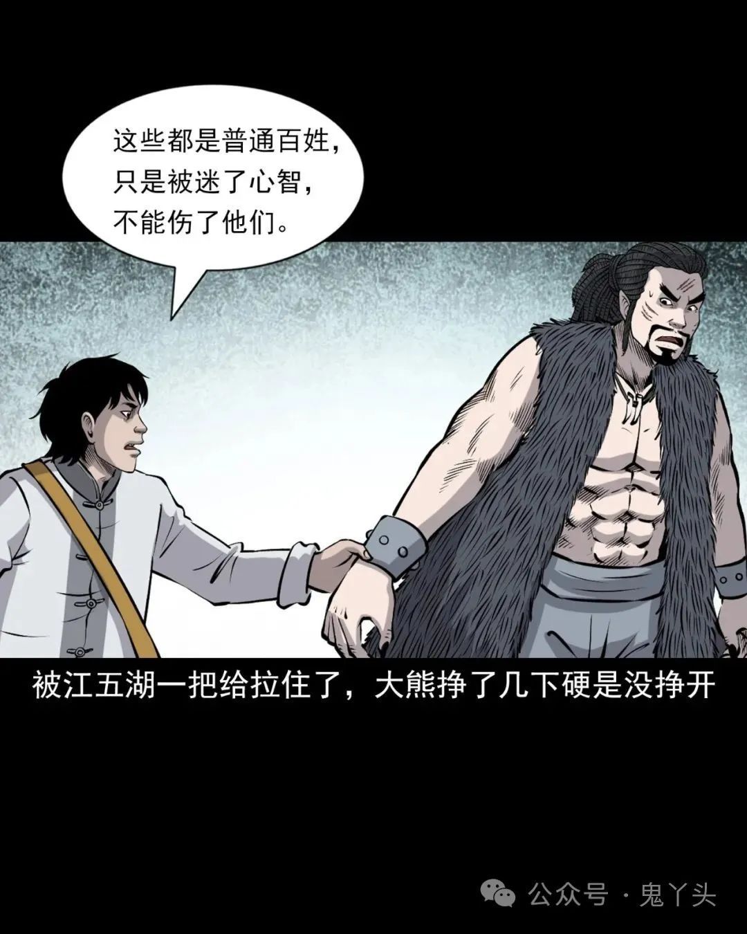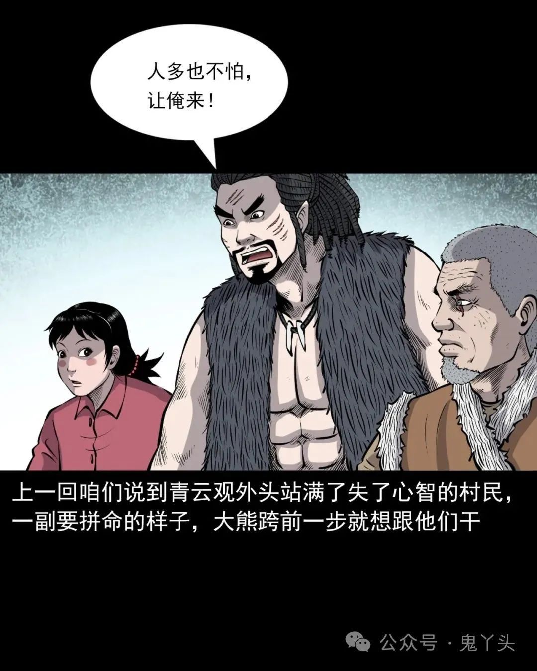 上ー回咱们说到青云观外头站满了失了心智的村民一副要拼命的样子,大熊跨前一步就想跟他们干!被江五湖一把给拉住了,大熊挣了几下硬是没挣开!老烟鬼又再次嘱咐他们要听江五湖的,江五湖从包里掏出一些符纸,往天上这么一扬,大熊看他假模假式的,心里老大的不